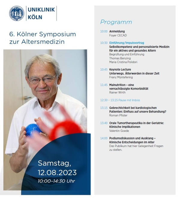 SYMPOSIUM - am 12.08 findet das 6. Kölner Symposium der Altersmedizin statt. Wir freuen uns auf ein abwechslungsreiches Programm rundum die neuesten Entwicklungen und Therapien in diesem Bereich.