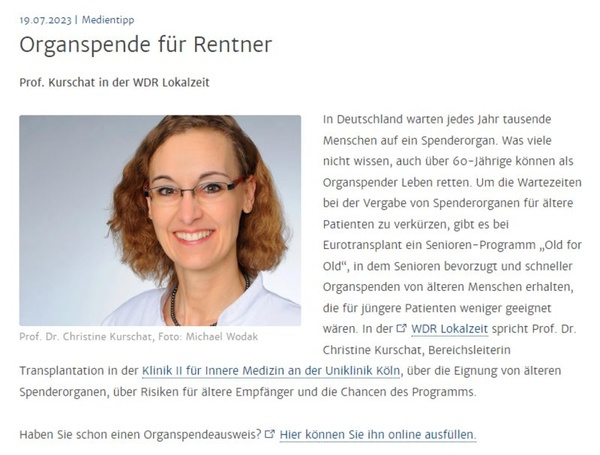 MEDIENTIPP - Organspende von und für ältere Menschen. Darüber spricht Prof. Dr. Christine Kurschat der Klinik II für Innere Medizin in der WDR Lokalzeit.